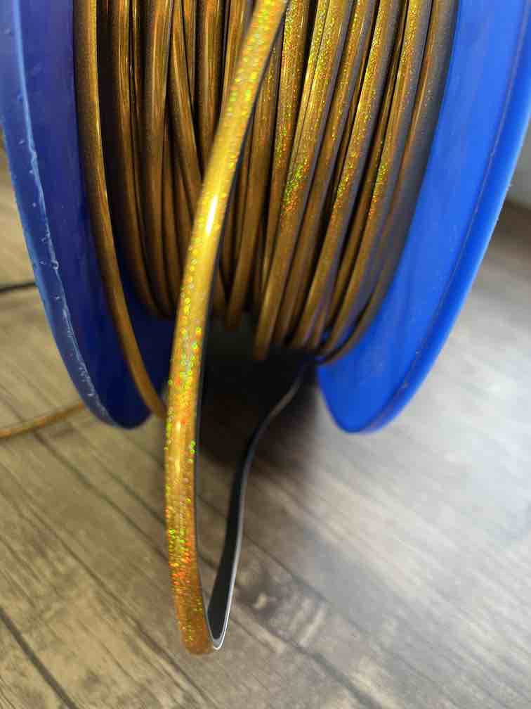 نوار باریک از جنس ورنی رنگ طلایی اکلیلی پهنا نیم سانت و در رولهای 5متری موجود میباشد مناسب برای ترین کیفها و کفشها و ساخت کمر بند