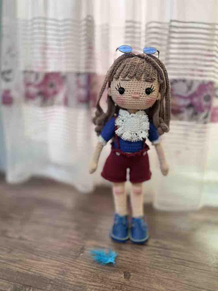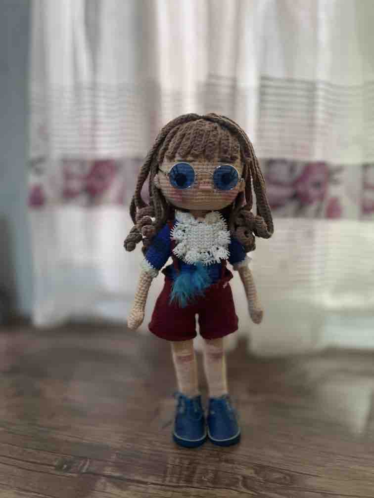 عروسک قلاب بافی بافته شده با کاموای درجه یک کیف و کفش چرم دستدوز موها بافته شده عینک دودی و فانتزی